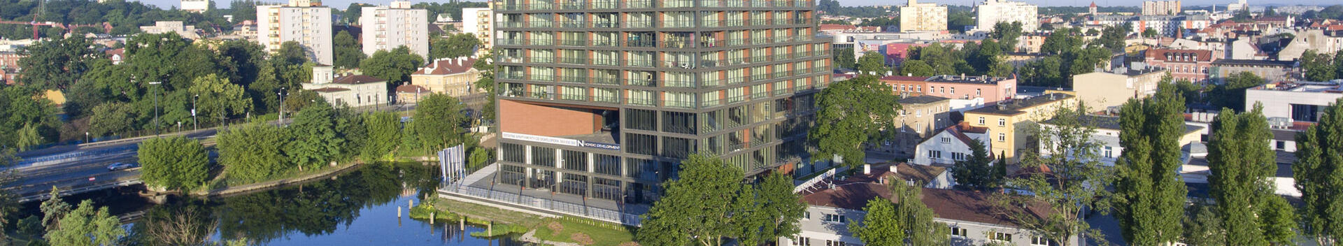 The building has cascading terraces that climb upwards, offering most floors uninterrupted views over the adjacent Brda River. On one side of the development, the building tops out at only four-storeys, in order to match an existing neighbouring structure. On the other elevations, Nordic Haven climbs up in terraces to its maximum 16-storeys height.