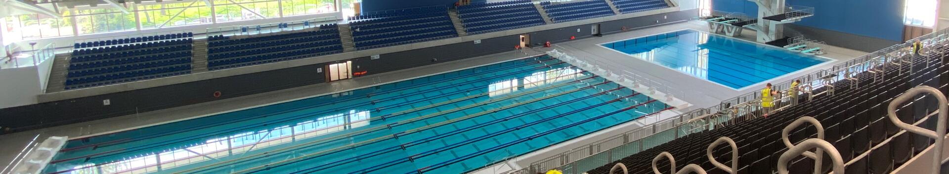As well as an Olympic-sized 50m-long competition pool, the Centre also includes a 25m diving pool, a smaller studio pool and 1,000 permanent spectator seats along the western elevation. Initially, the facility also included temporary seating, which was removed after the Games in readiness for the Centre to be opened for public use in early 2023.