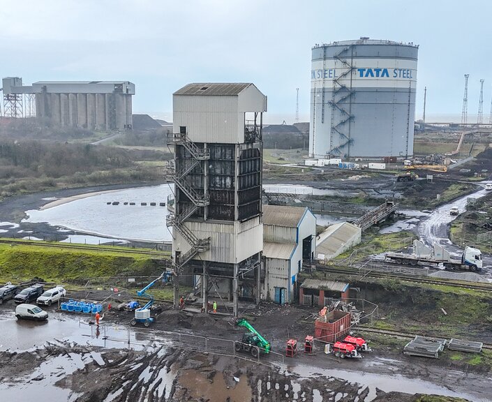 This morning / afternoon, with the support of expert contractor partners, Thompsons of Prudhoe, Tata Steel has safely and successfully demolished the HAA material handling structure on the south side of the steelworks. The area will be cleared, and the materials recovered for recycling.